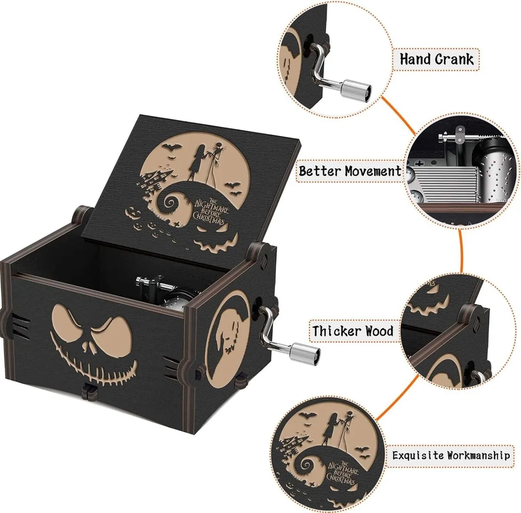 Com um visual esculpido à mão e detalhes que brilham no coração de qualquer fã de Halloween Town, essa caixa de música é uma verdadeira peça de coleção! Basta girar a manivela manualmente e a melodia encantadora do filme “O Estranho Mundo de Jack” (The Nightmare Before Christmas) vai ecoar como um feitiço nostálgico. Feita em madeira entalhada, sem necessidade de pilhas ou eletricidade. Um presente perfeito para fãs, góticos suaves e apaixonados por música retrô!