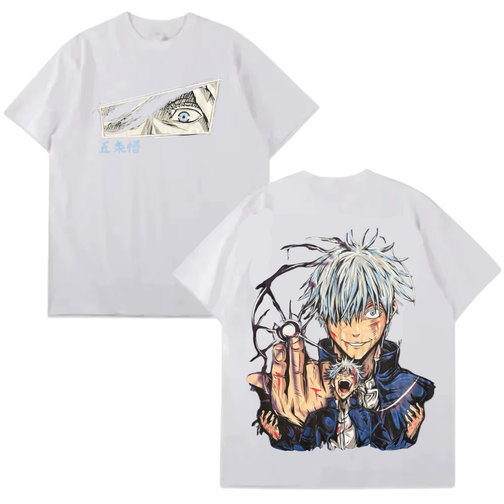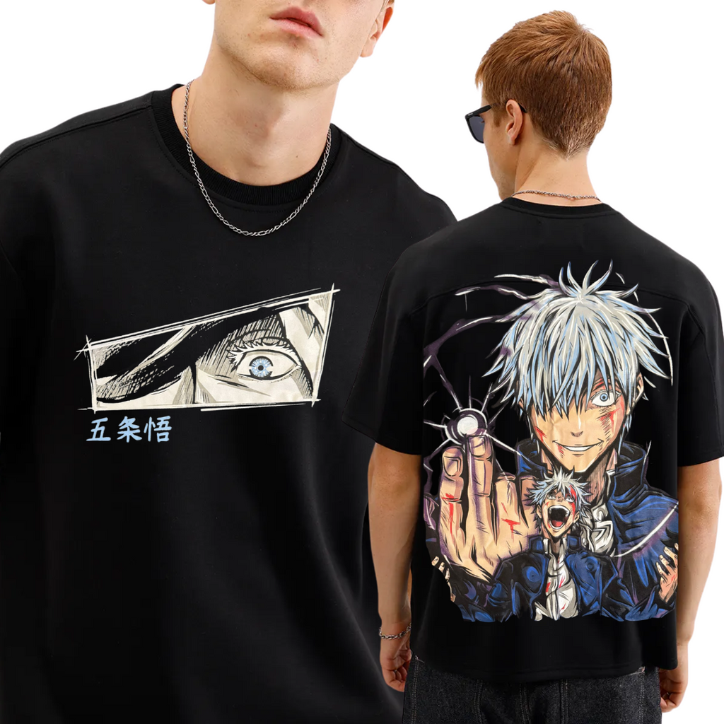 Essa camiseta oversized traz o olhar penetrante e o poder arrebatador de Gojo Satoru, o feiticeiro mais temido de Jujutsu Kaisen. Com estampa frontal minimalista e arte nas costas de tirar o fôlego, ela foi feita para fãs que querem carregar o infinito no peito e nas costas.