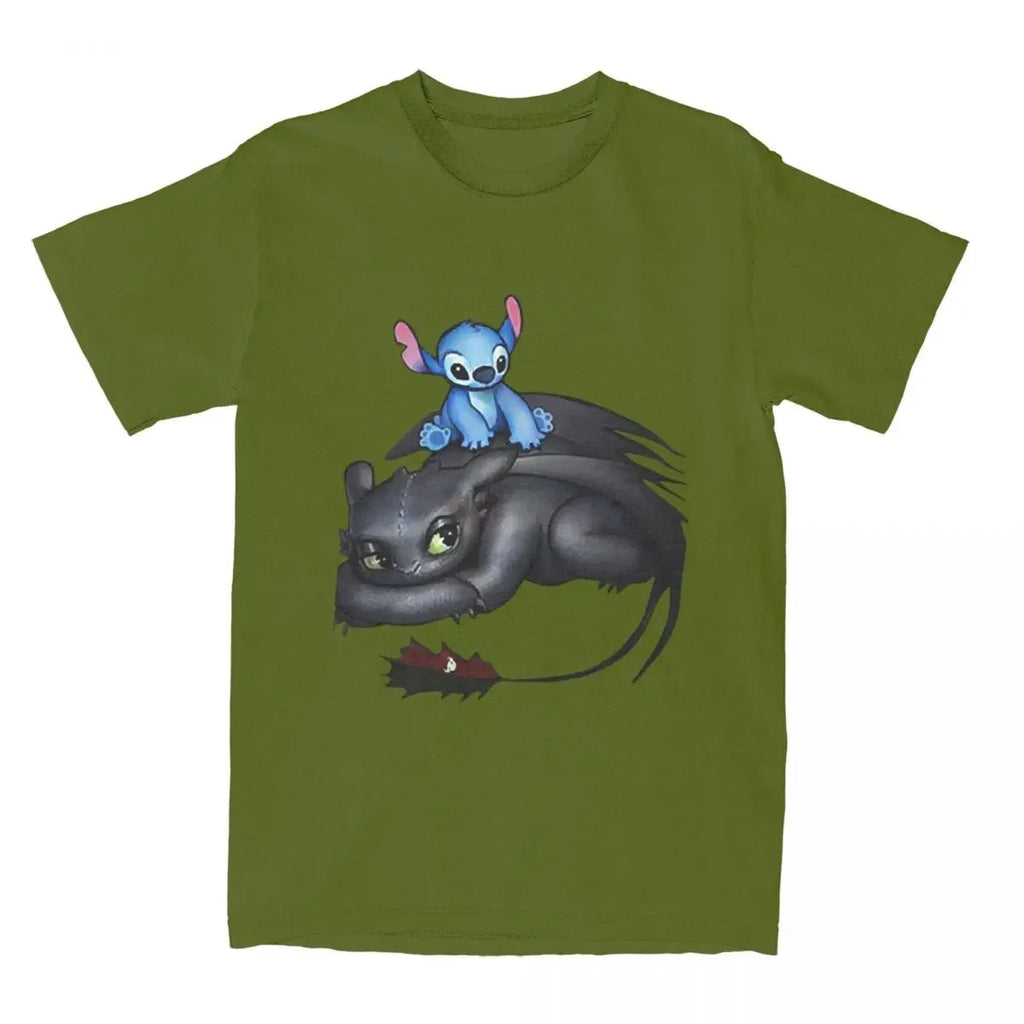 Nesta estampa ultra carismática, Stitch aparece empoleirado sobre um Banguela preguiçoso, criando um visual divertido, fofo e totalmente fan service. Ideal pra quem é fã de Disney, DreamWorks e não abre mão de conforto e estilo no dia a dia.
