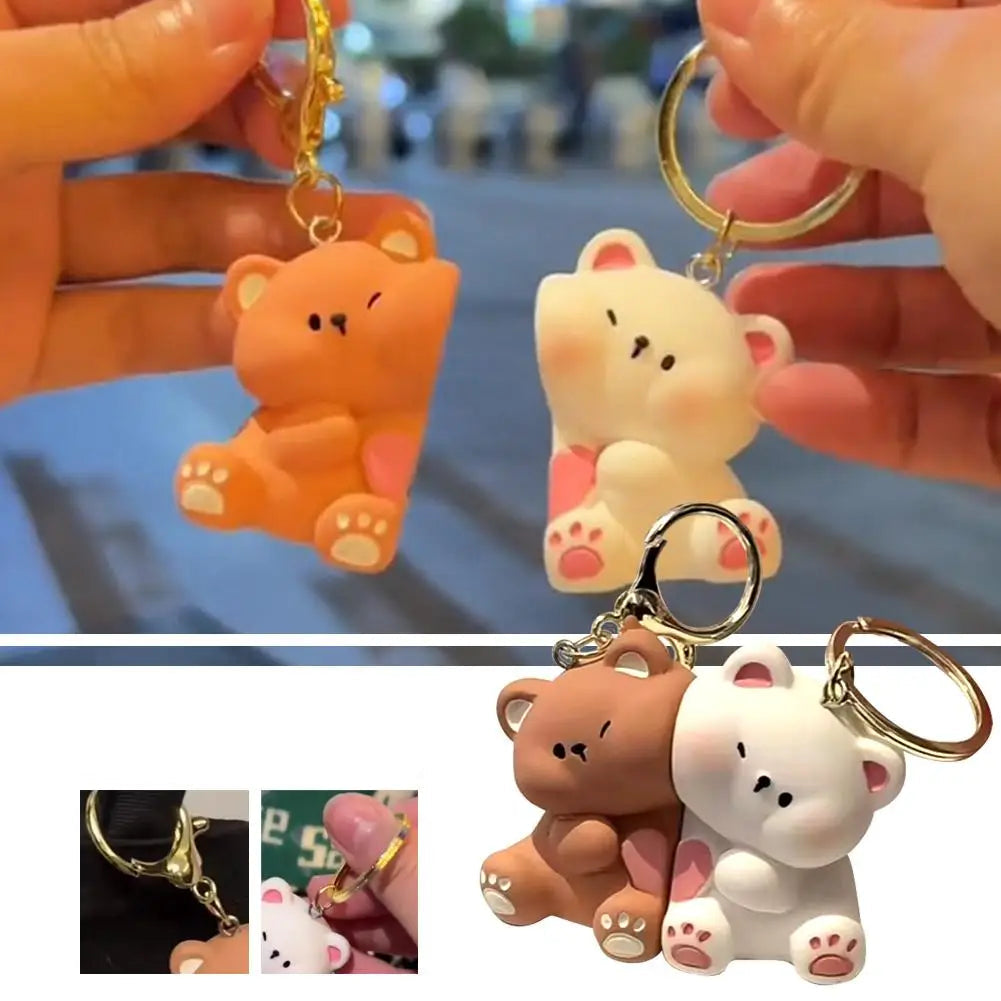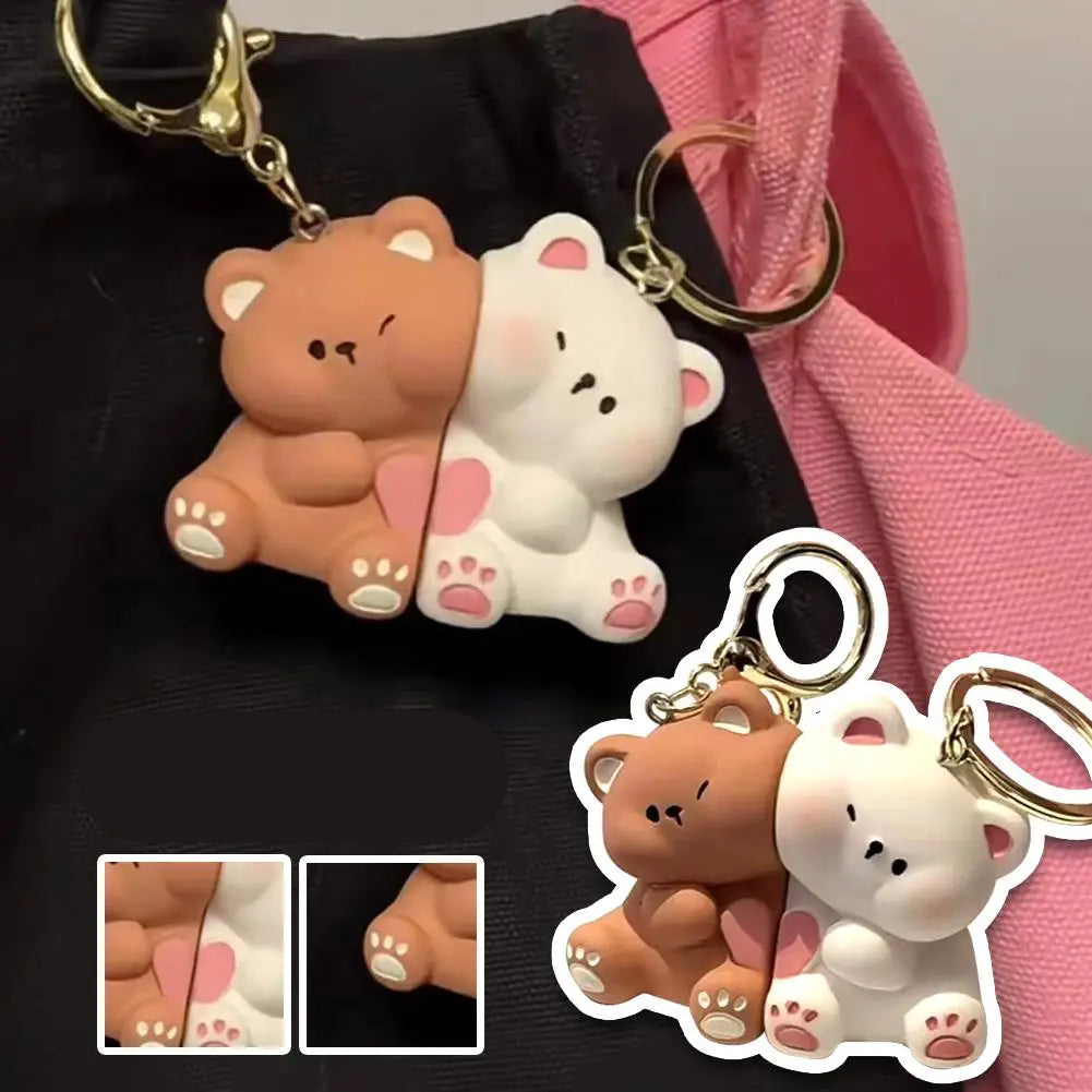 Esse par de chaveiros magnéticos em formato de ursinhos foi feito para casais ou melhores amigos que se completam. Um é caramelo, o outro é branquinho — e quando se encontram, se abraçam com a ajuda de um ímã invisível que os mantém juntinhos. ✨