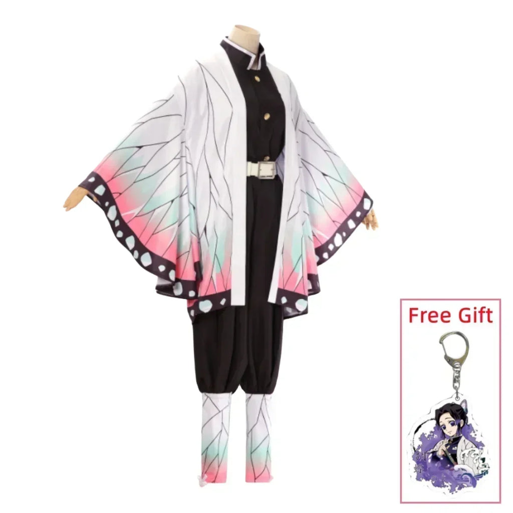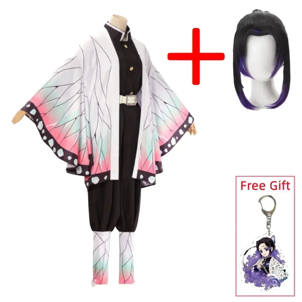 O conjunto reproduz com fidelidade o uniforme do Esquadrão de Caçadores de Demônios, acompanhado do icônico haori em degradê lilás, rosa e verde-água, simbolizando as asas de uma borboleta.
