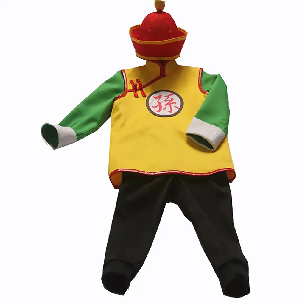 Essa fantasia é inspirada no visual clássico do Gohan criança (Dragon Ball), com detalhes fiéis ao anime: túnica amarela com o kanji "孫" (Son), mangas verdes, chapéu vermelho com a esfera do dragão de 4 estrelas e até a cauda de macaco do saiyajin!