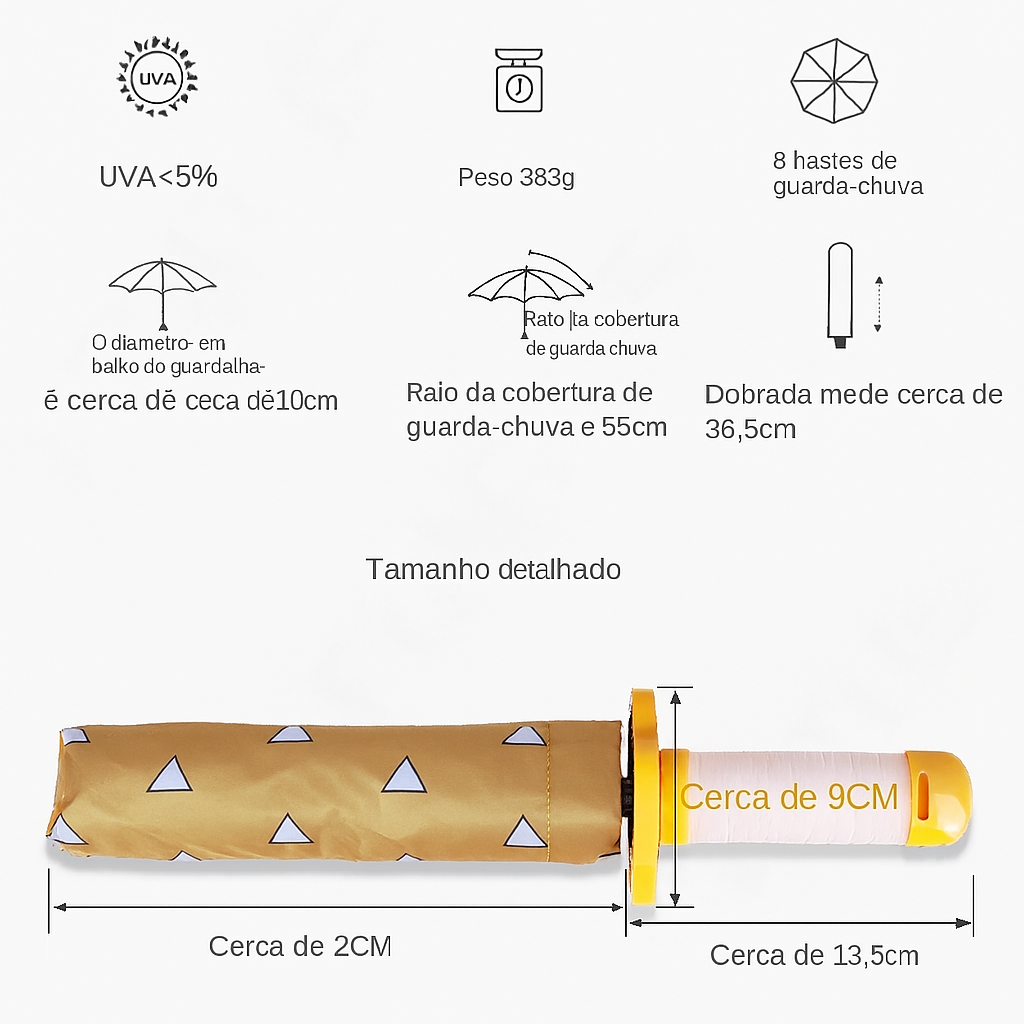 Transforme os dias de chuva em cenas épicas com este guarda-chuva inspirado nas Espadas Nichirin de Demon Slayer! Com design fiel aos personagens como Tanjiro, Zenitsu, Rengoku e outros caçadores de oni, ele simula o cabo de uma katana e vem com capa temática estilosa.
