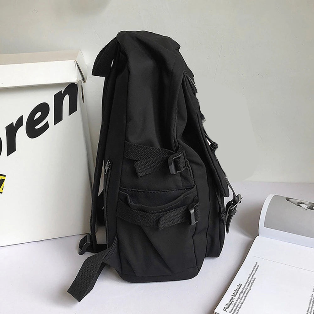 • Exterior: Bolso com aba frontal e bolsos laterais com botão
